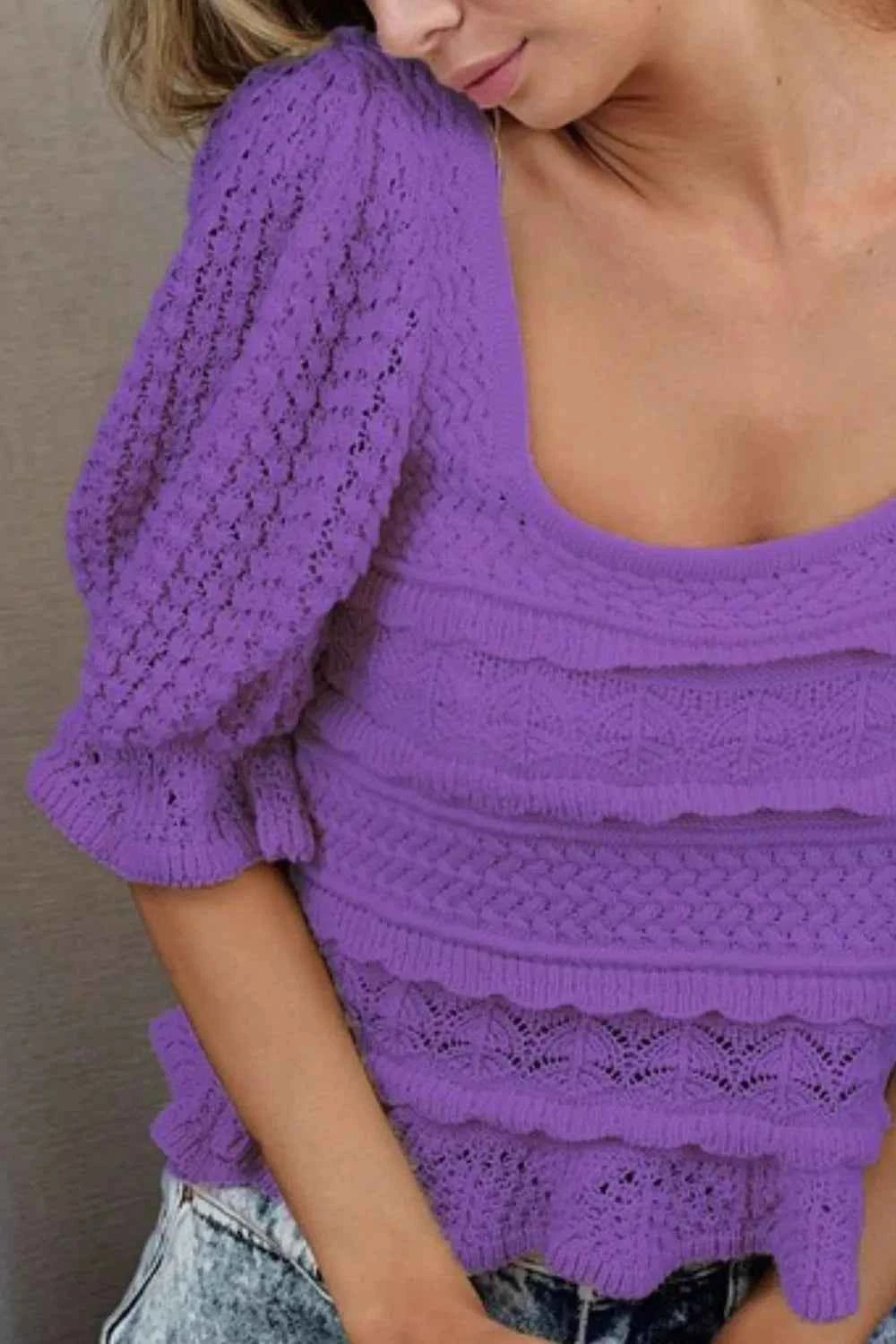 A Square Neckline With Puff Sleeve Crochet Top features a stylish square neckline and statement puff sleeves crafted with a delicate crochet design. This trendy top combines modern and romantic elements, making it perfect for both casual outings and special occasions. Pair it with high-waisted jeans for a chic and feminine ensemble.