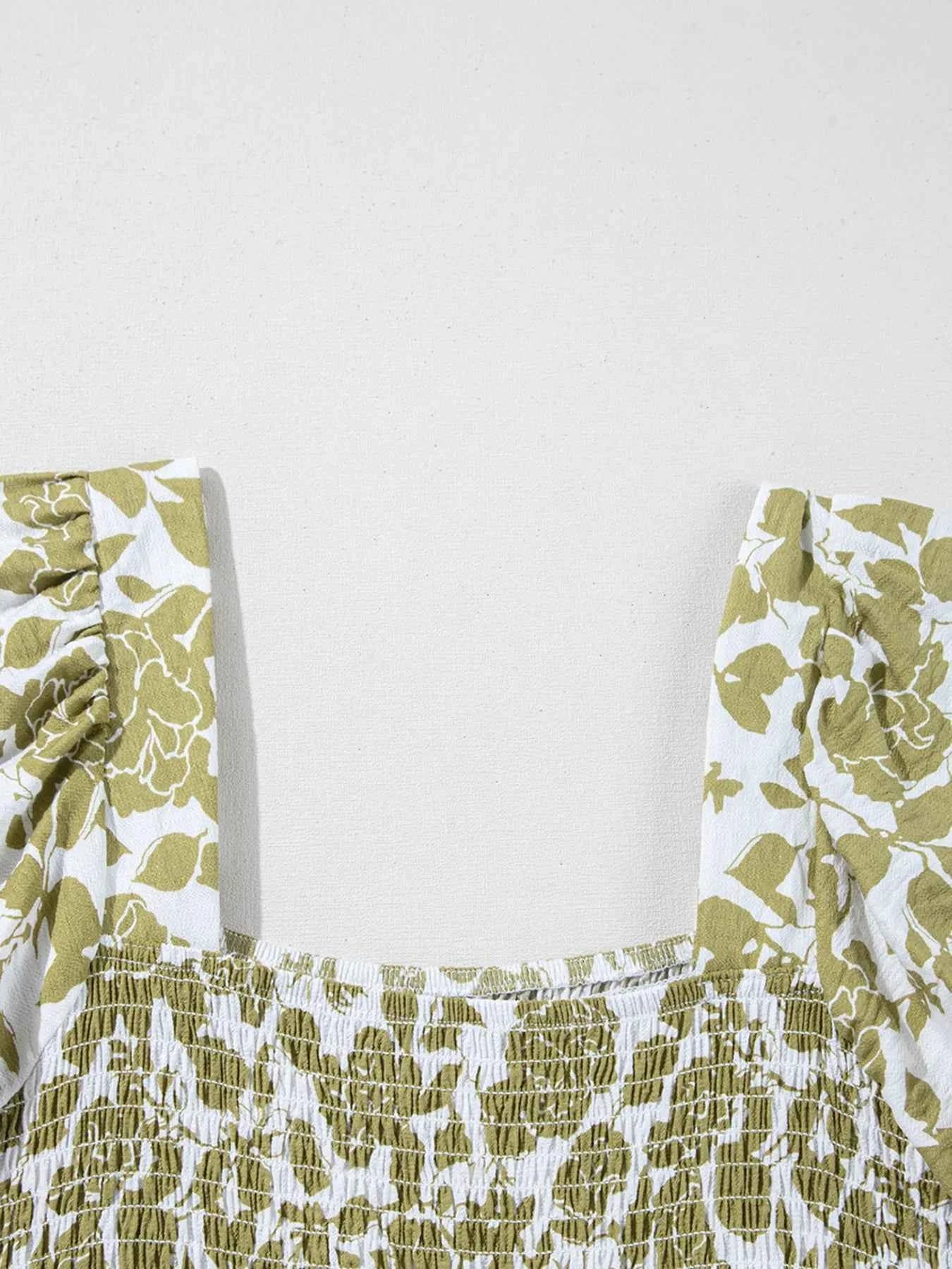 Boho Floral Square Neck Smocked Bust Puff Sleeve Tiered Dress
