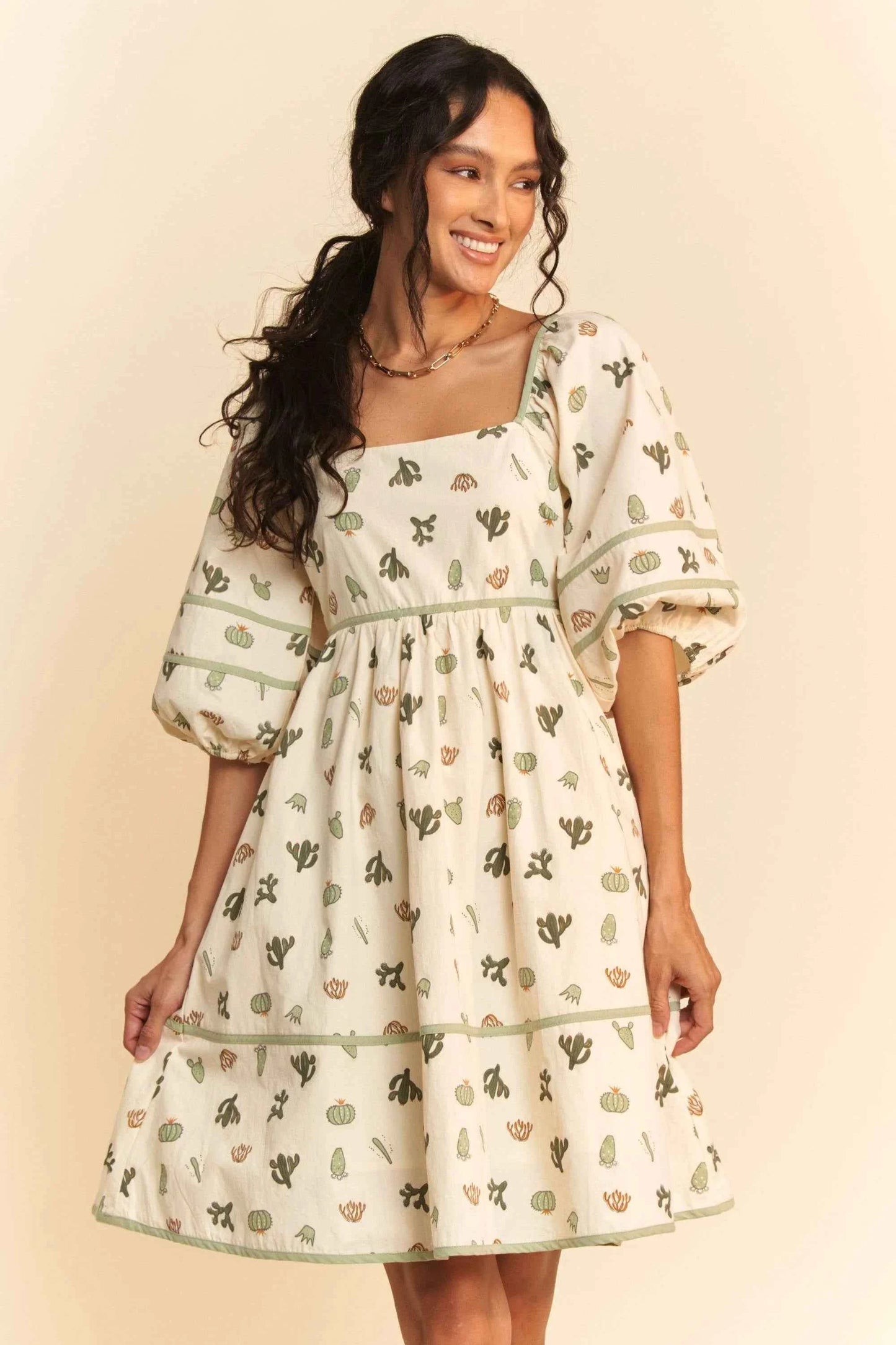 Davi & Dani Cactus Printed Poplin Contrast Piping Mini Dress