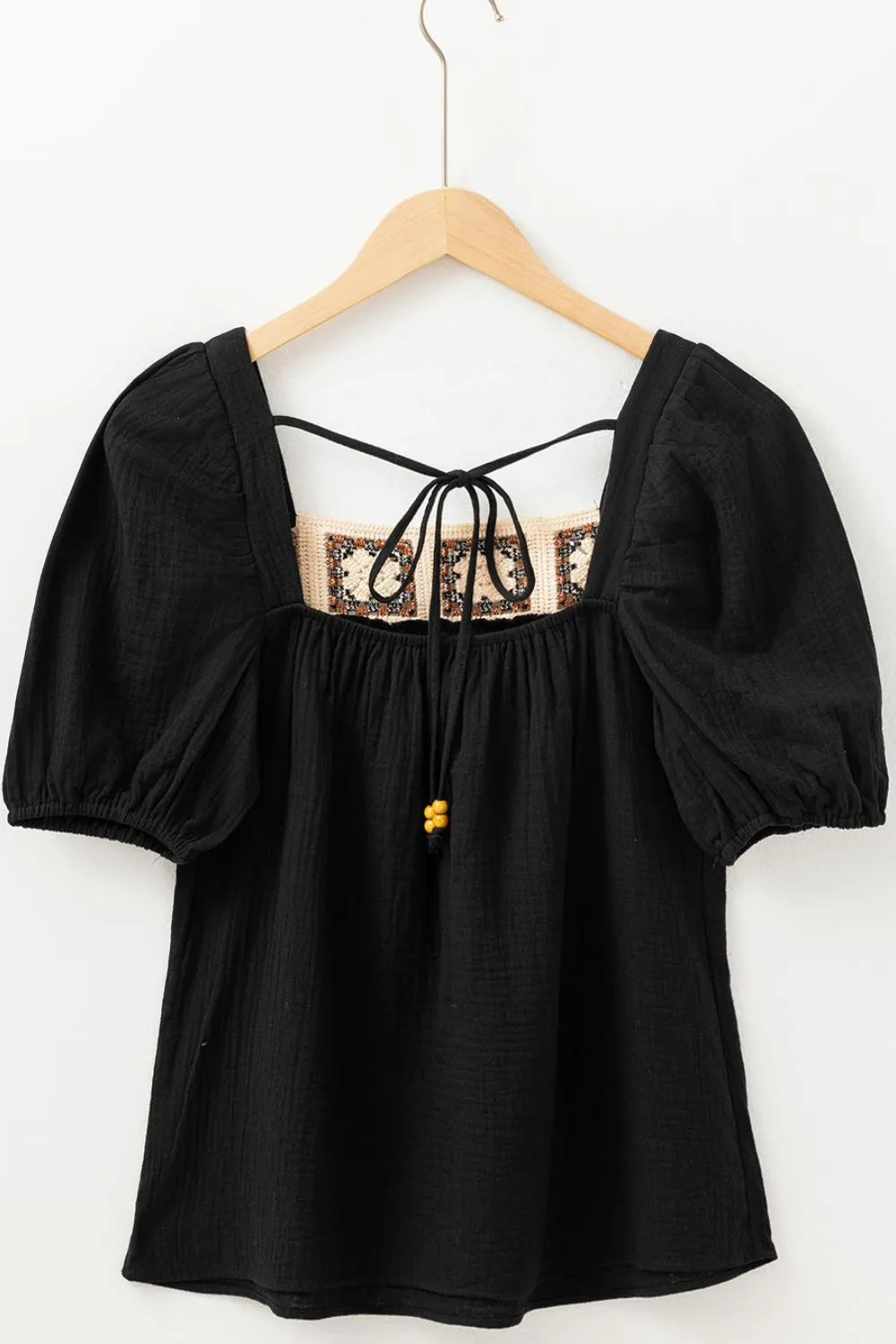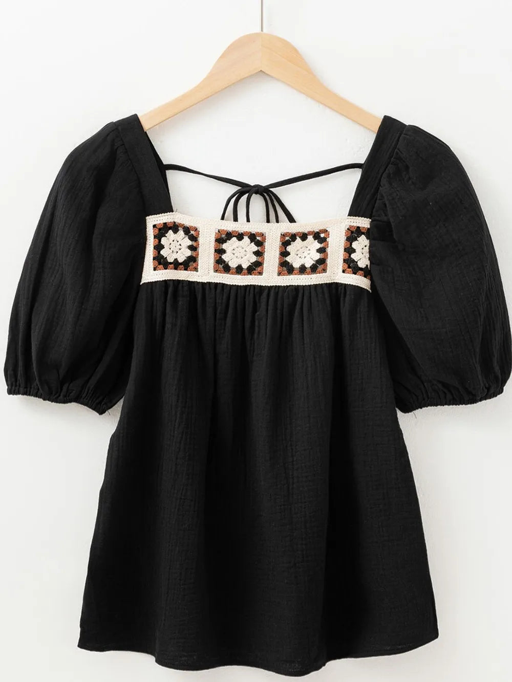 Flower Crochet Square Neck Puff Sleeve Blouse