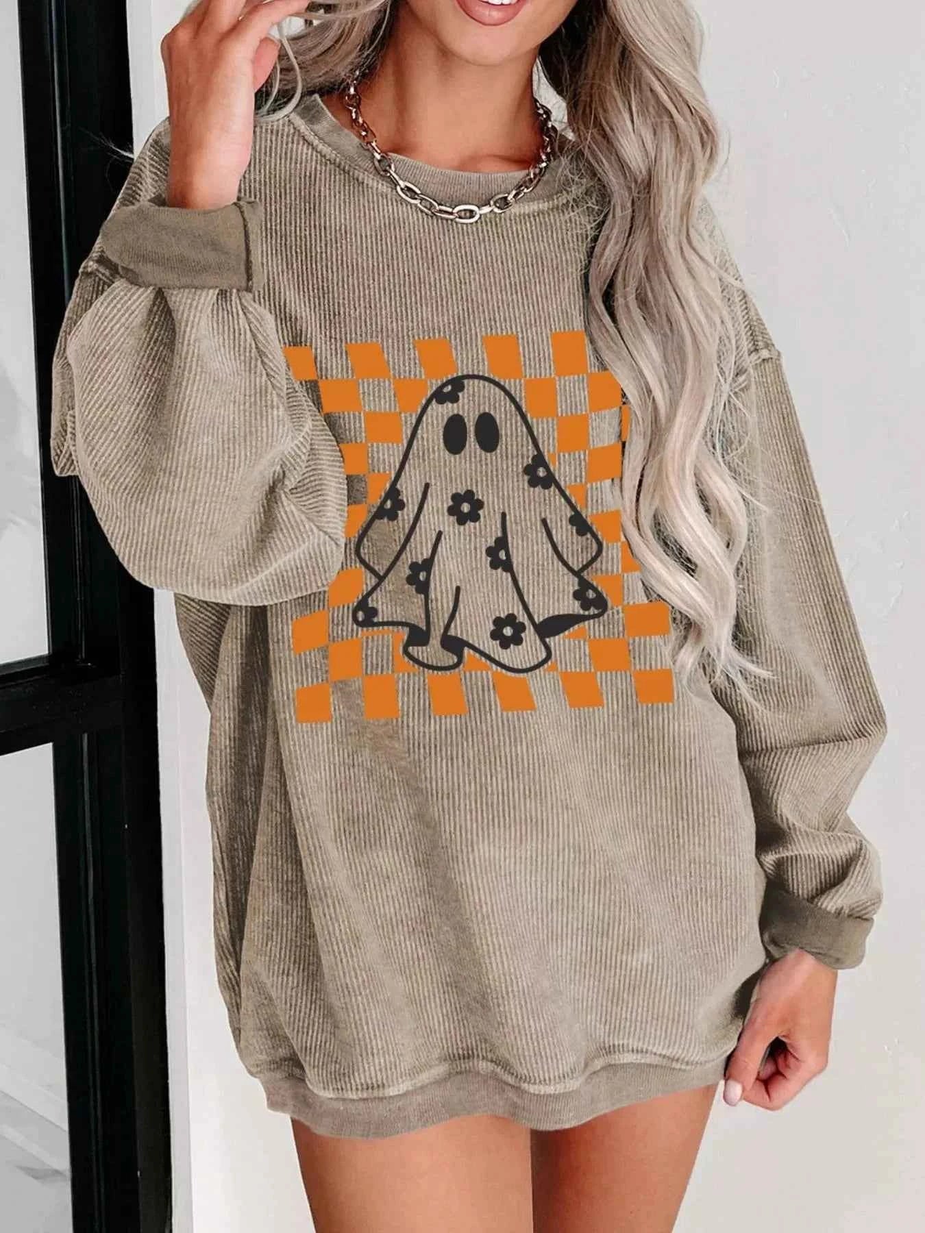 Halloween Checkerboard Floral Ghost Graphic Corded Sweatshirt