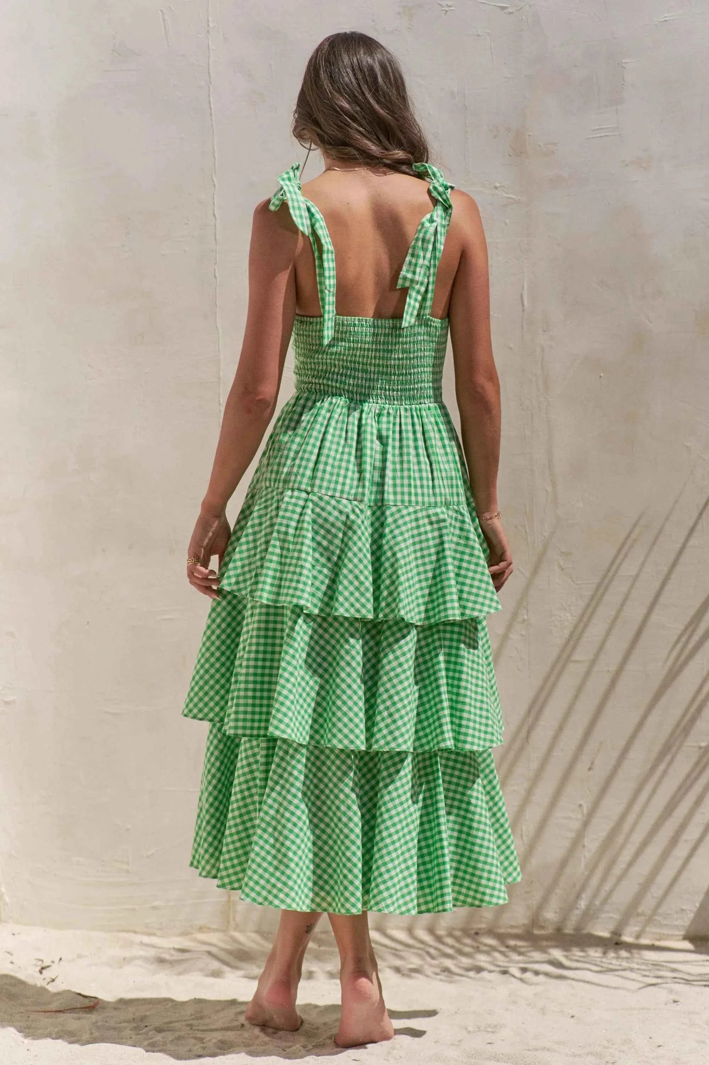 This charming Jade By Jane midi dress features a timeless green and white gingham check pattern in a lightweight, breathable cotton blend fabric. The sleeveless design showcases a flattering V-neckline with decorative button accents, while the empire waist flows into cascading tiered ruffles that create beautiful movement. A daring thigh-high front slit adds modern appeal and ease of movement. Perfect for summer picnics, beach vacations, or garden parties, this versatile dress combines vintage-inspired gingham with contemporary design elements. The midi length offers elegant coverage while remaining breezy and comfortable in warm weather.