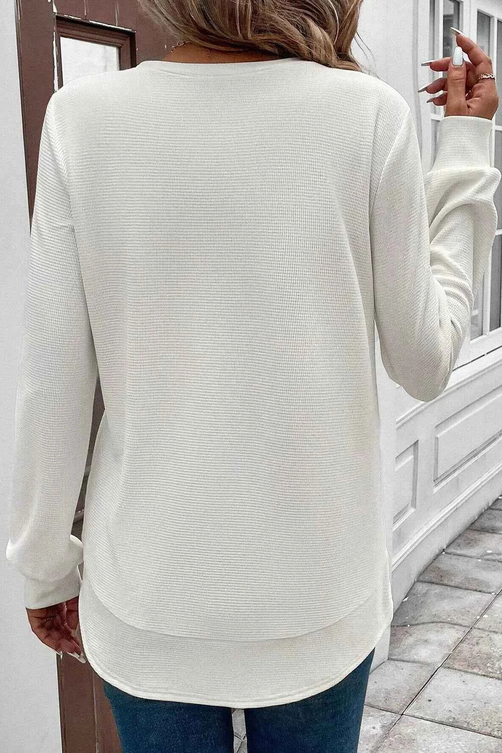 Rounded Neck Waffle Long Sleeve Top