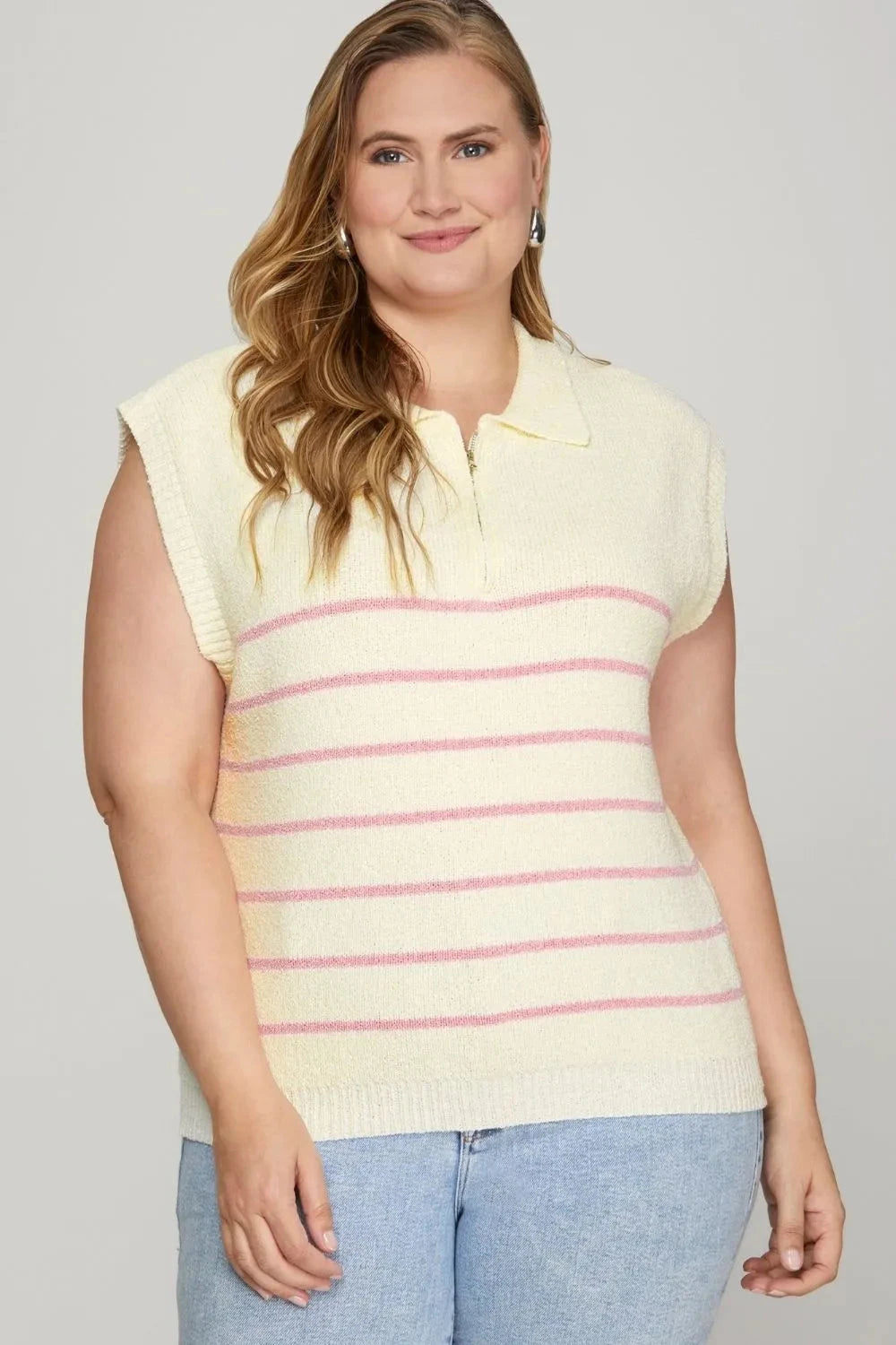 She + Sky Full Size Ribbed Hem Striped Half Zip Sweater Vest Plus Size