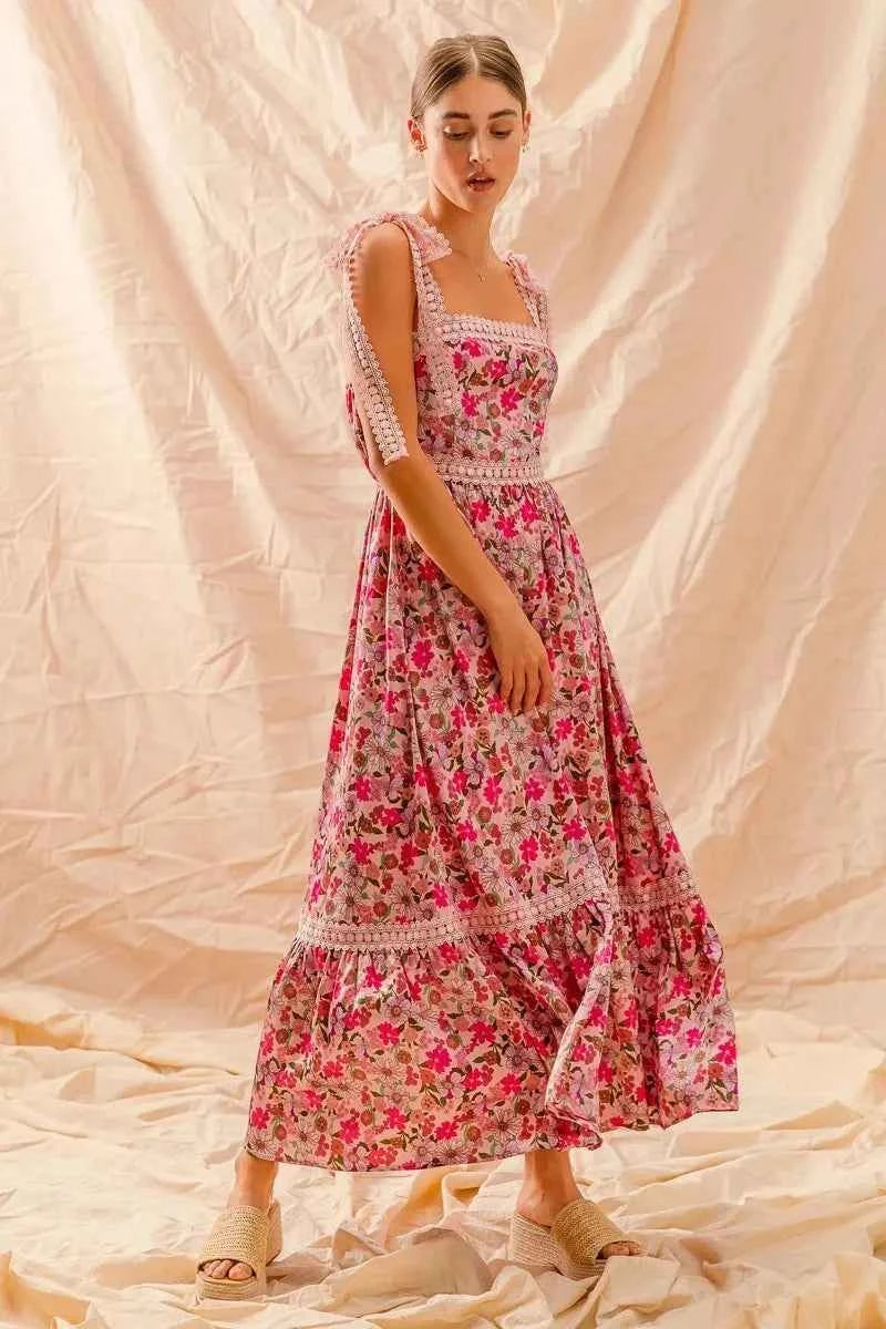 SO ME Floral Maxi Dress With Ribbon Tie Lace Strap