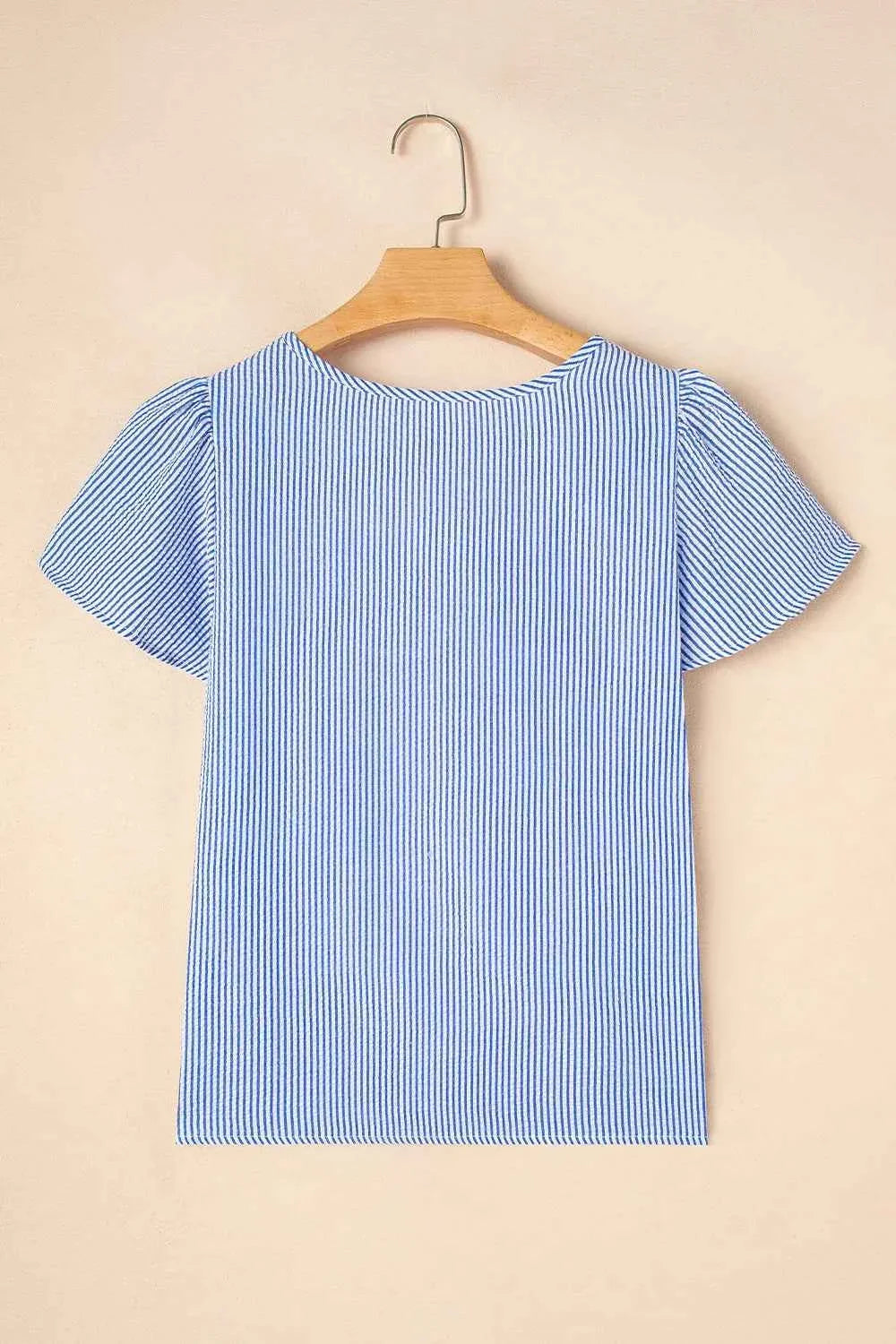 Stripe Textured Ruffle Short Sleeve Boho Detail Square Neck Blouse