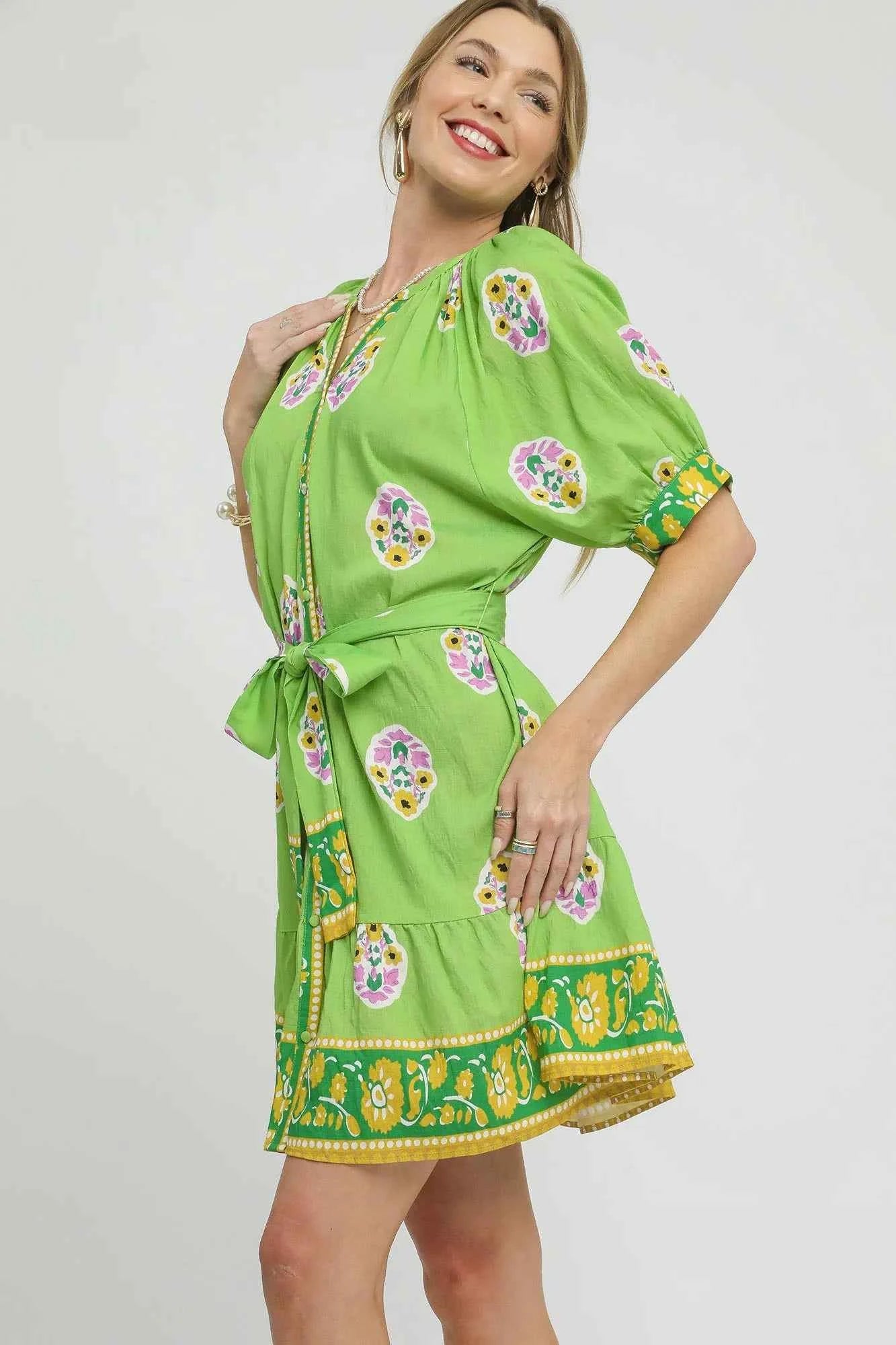 This stunning bohemian-inspired shirt dress features a vibrant green base adorned with eye-catching floral prints throughout. Crafted from lightweight, breathable fabric perfect for warm weather styling. The button-front design offers versatility while the included self-tie belt creates a flattering waistline silhouette. Short sleeves with subtle gathering add feminine charm, while the knee-length cut with decorative border trim provides elegant coverage. The relaxed fit ensures all-day comfort making it ideal for casual outings, weekend brunches, or vacation wear. The bold floral motifs and rich green colorway create a fresh, garden-inspired aesthetic that's both fashion and timeless.