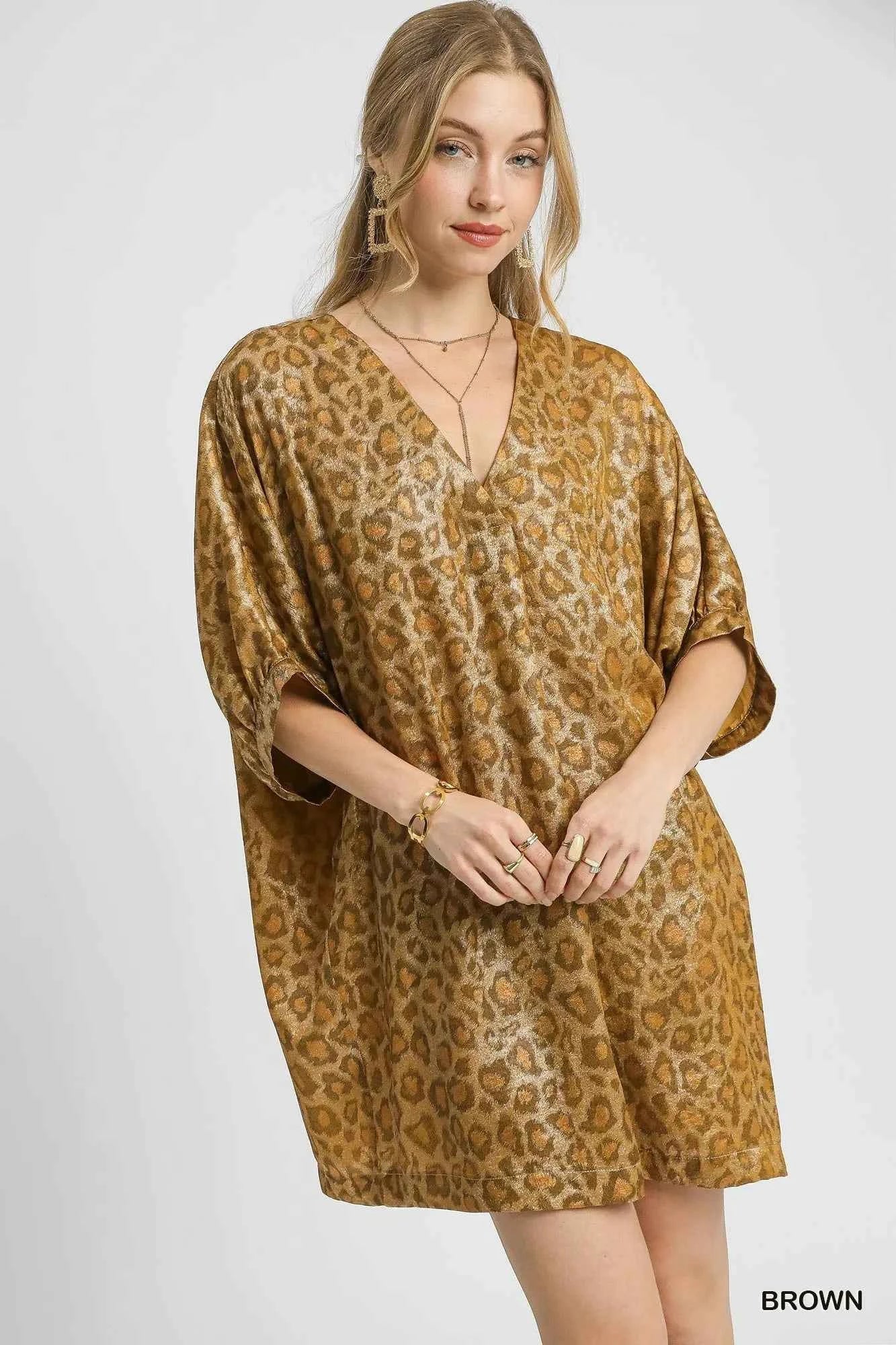 Umgee Metallic Leopard Print V-Neck Kimono Dress